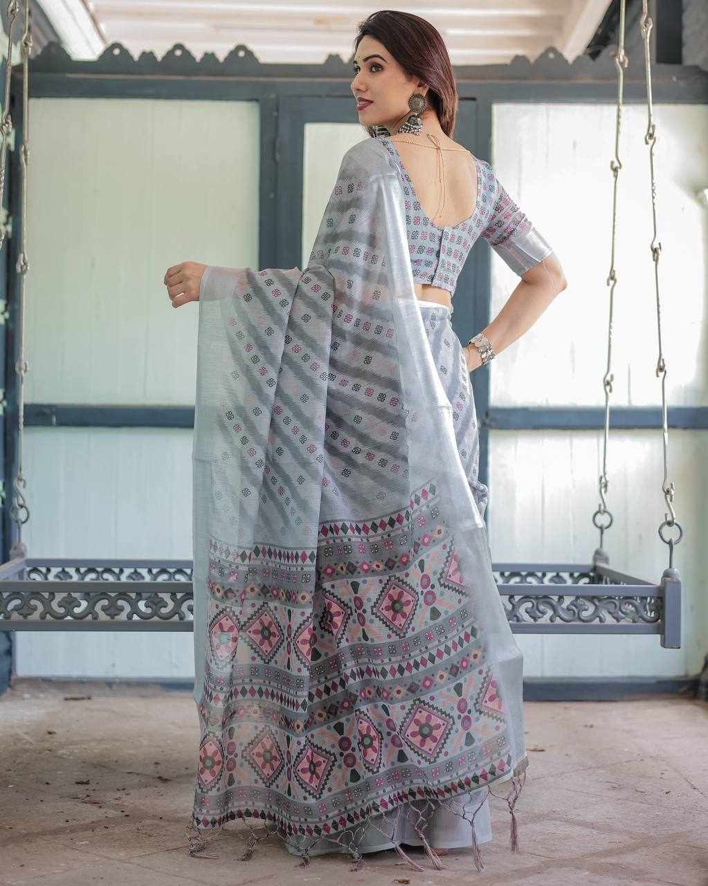 Premium Silver Weaving Linen Cotton Saree